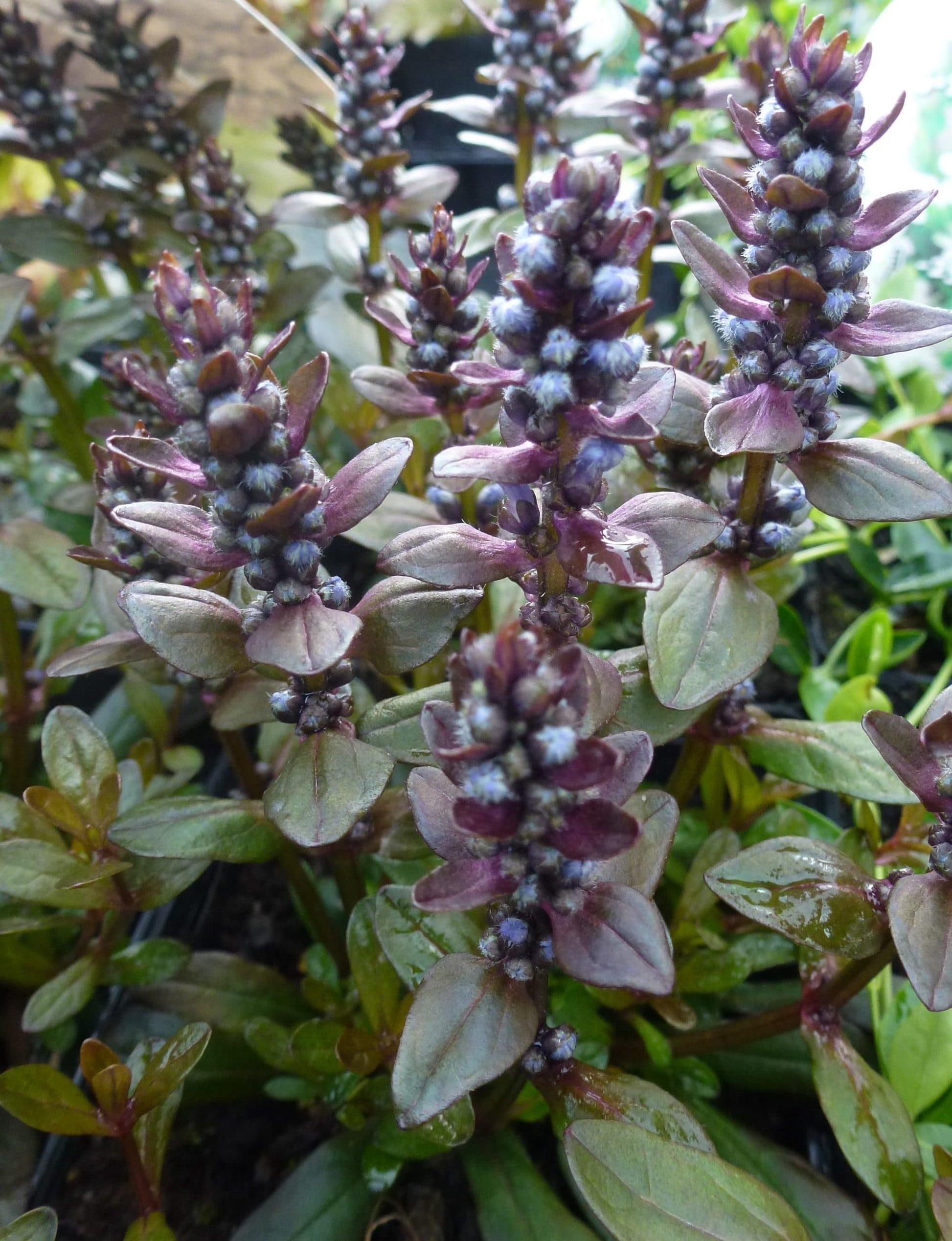 Ajuga Chocolate Chip is a distinctive groundcover known for its striking foliage featuring deep purple leaves with chocolate brown accents. This hardy perennial thrives in partial shade to full sun.